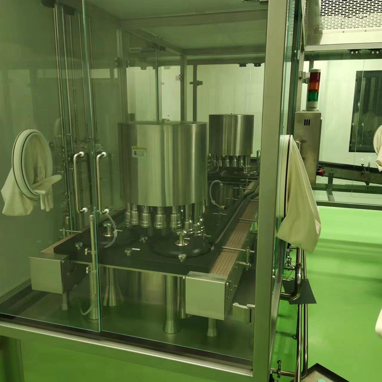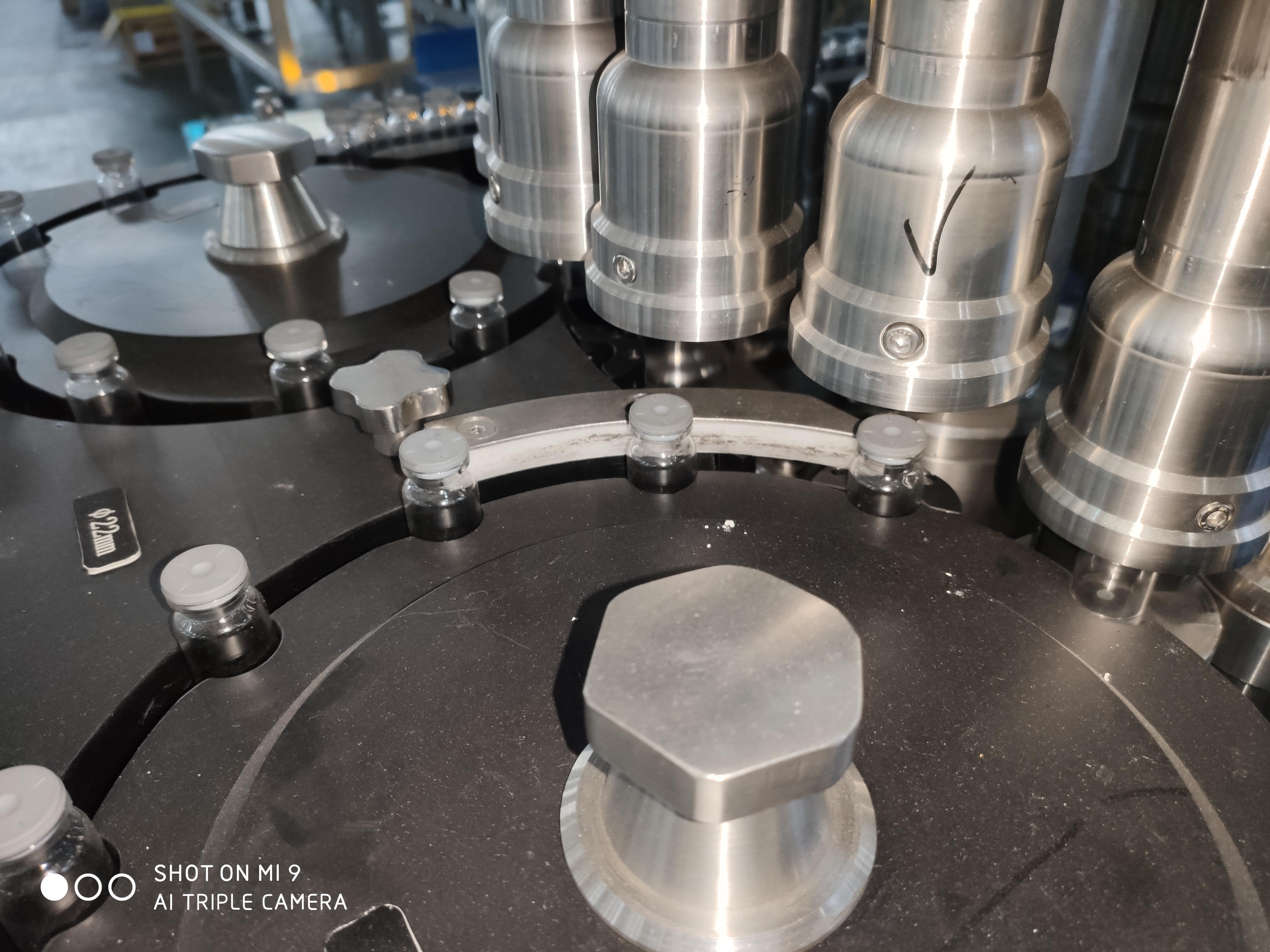 真空壓塞機將西林瓶從進瓶網(wǎng)帶進瓶,經(jīng)過進瓶撥盤有序進入吸真空系統(tǒng)瓶子在真空罩內(nèi)自動拔出膠塞抽出瓶子內(nèi)的真空后再把膠塞壓上后進入出瓶撥盤.西林瓶通過出瓶撥盤送至出瓶輸送帶進入下一道工序。
